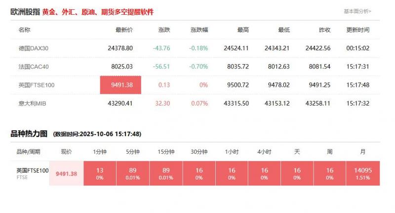 意大利富时MIB指数10月6日(周一)开盘下跌105.11点,跌幅0.24%,报43153.00点。