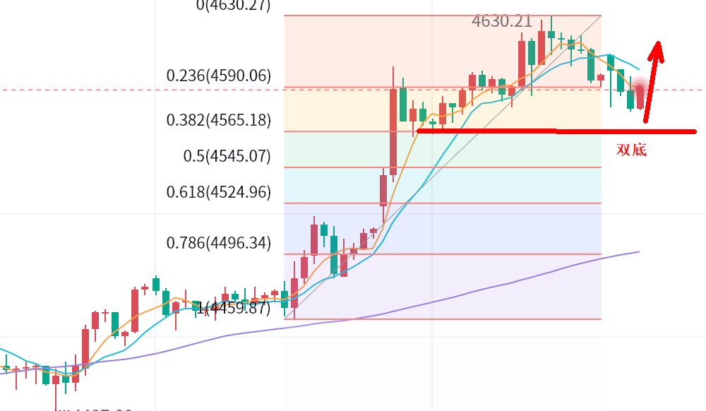 2,昨日上升回撤382位置4574,但现在看不合适,移动到前面低点,382位置重合双底在4564-66一线,这是日内要关注的点。