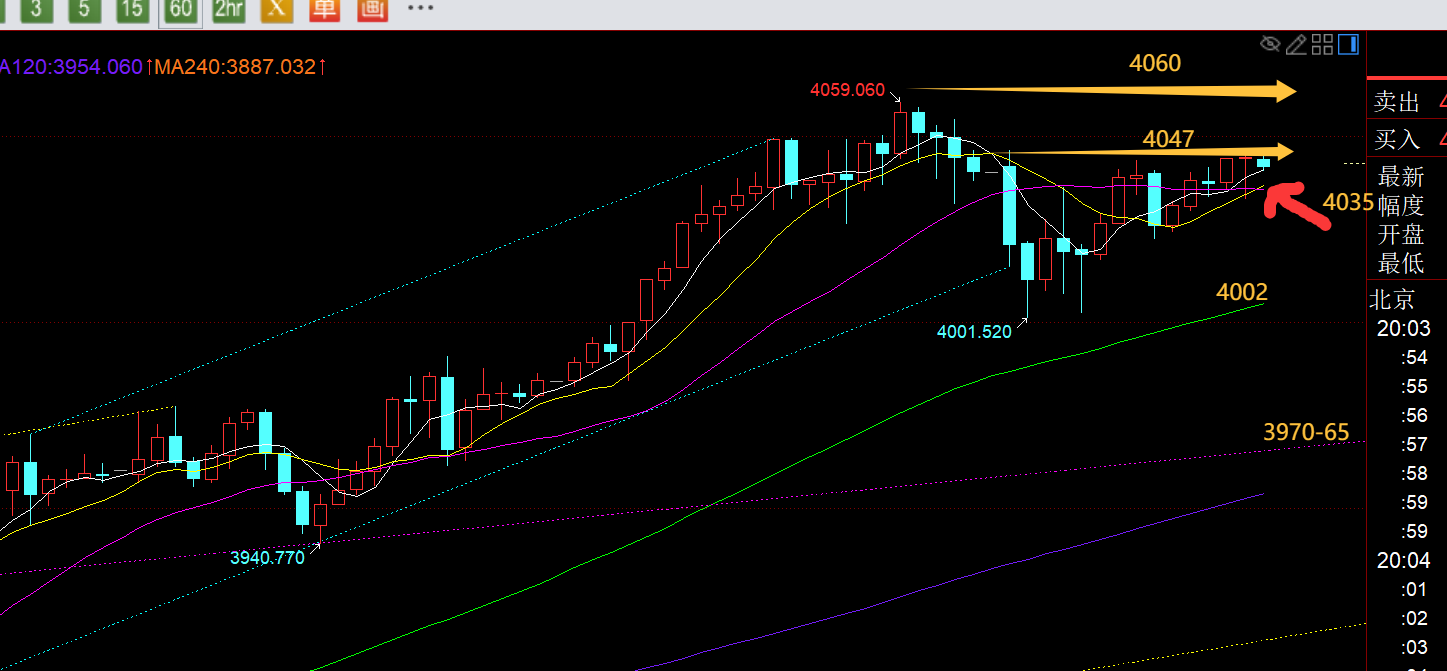 黄金方面:昨日早间直接强势续涨,连阳发力冲到4035出现一些承压,当时也是短期通道的上轨阻力位,另外日线开始脱离5均线,则高位不太敢继续追涨,依托上轨阻力,轻仓逆势尝试看一波回踩,再等待4005之上继续顺势看涨,可惜回踩力度不佳,最终继续上破出局; 而美盘一直围绕4030-4050区间横盘,则强调日内已拉升70米,随时谨防一波跳水修正,等了几个小时一直高位运行不跌,因为只有小时线10日失守,才能看一波下行,结果收盘前最后一个小时才失守,今日开盘直接下挫40米;