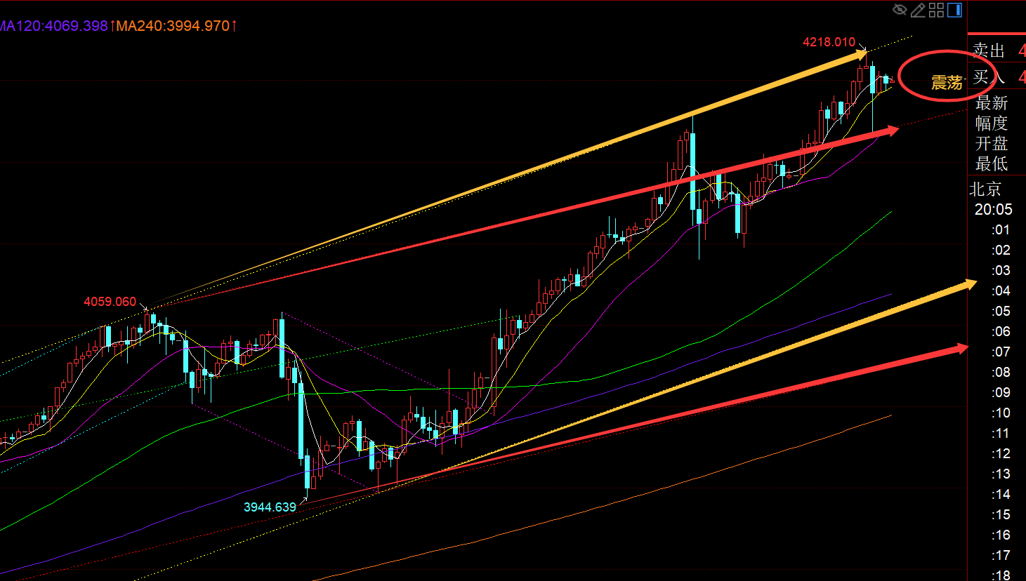 第三,黄金小时线级别:一般来讲,隔夜大跌之后,第二天会寻求凌晨反弹高点或分割阻力位,或中轨,大阴等阻力来尝试是否延续下跌,尤其是早间开盘先向上急拉的话,是很容易不延续而冲高回落;一早先拉升,承压4273.5一线回落,于周视频提及的4277压力略差,第一次跌至4218反弹再测试4270一线,4218这个位置刚好是618分割支撑;午后承压4270也是靠近中轨压制一波,跌至4221,又企稳反弹至4265;价格来来回回的反复,看似杂乱无章,其实它可能在走一个收敛三角整理,高点逐步慢下移,低点逐步慢抬升,也可以看做是一个平行通道整理,风水岭阻力4274,风水岭支撑4220左右,50米范围内运行;另外这种快速短线上下来回走的行情,稍犹豫要么进不去相对好的高低点,要么有了利润想贪,就打回你原点位,要么你为了求保,下移防守打了再抵达你原本的目标空间;所以,只能见好就收,但最终它肯定会打破平衡,走一个方向去突破或扩大震荡区间,就要留意66日均线阻力4268一线,以及4274亚盘高点,如果向上突破这两个阻力,是连阳突破或大阳突破66日之后,那么才可以考虑回踩去跟随看涨,至少可以做一波次高点,看618分割阻力4305,甚至前期通道衍生反压点4330之下;反之,若无法突破这两个阻力位,是可能存在一波向下打压的,尤其是有效破位图中红色趋势线对应当前支撑4240,同样也要连阴或饱满大阴跌破才算有效,那么可以去试探上周五低点4190-4185范围,看它得失;当然,只要敢再拉低,macd就会出现底背离,企稳会出现相对不错的后市低位看涨点;上升趋势不会改变,下跌调整修正都是为了后市进一步刷历史新高做准备的;