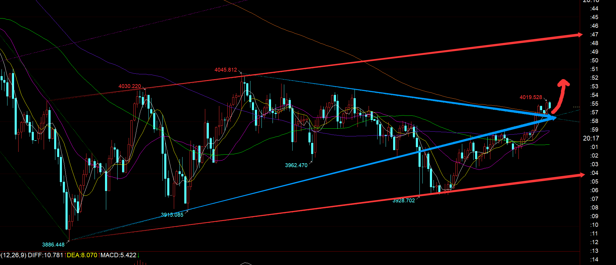 第二,黄金4小时级别:今日探底拉升,连阳站上了中轨,此时正在攻克下一个关键的位置66日均线4015,一旦23点收线,有效大阳突破站上,那么上方空间就会逐步打开;
