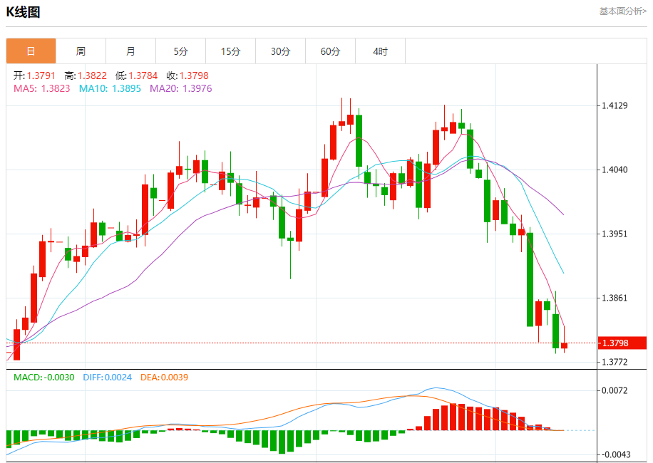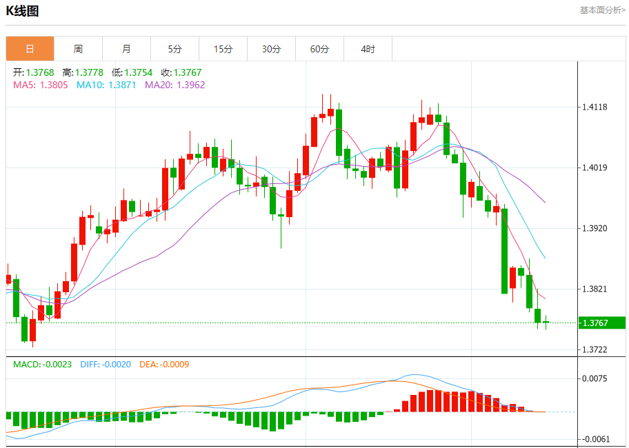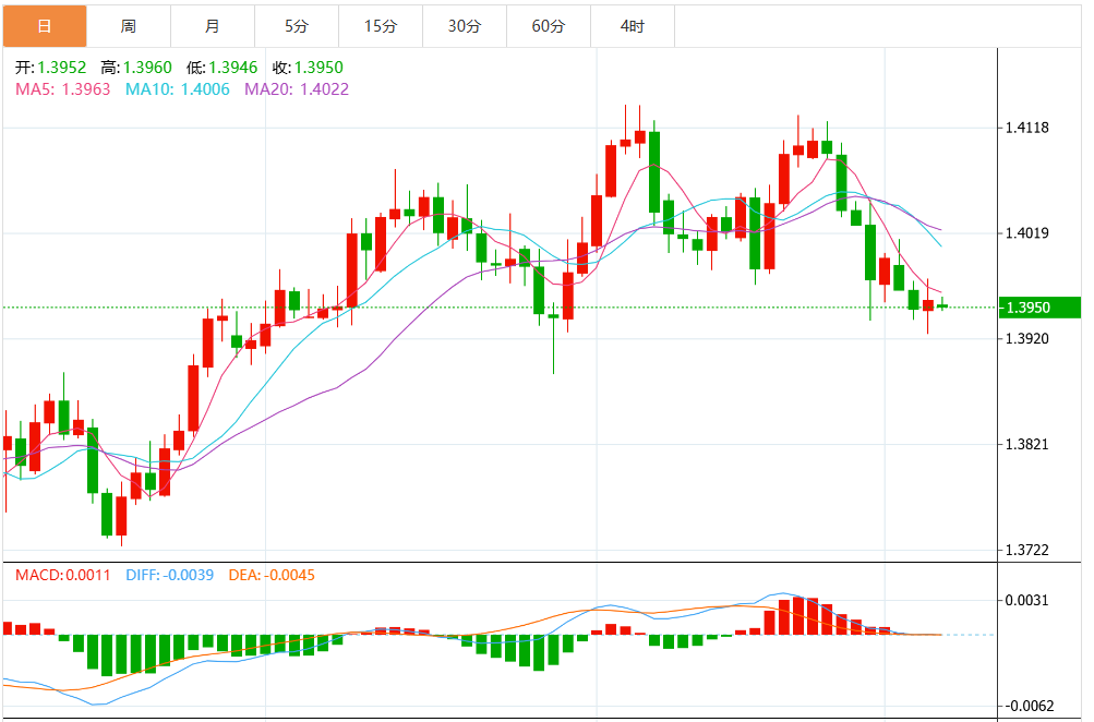美元/加元在上周小幅下跌至1.3538后反弹。考虑到DMACD的看涨收敛条件,短期底部可能已经到位。坚决突破1.3749支撑位转阻力位将使1.4014集群阻力位(1.4791至1.3538的38.2%回撤位1.4017)转回上行,作为修正举措。尽管如此,突破1.3633次要支撑位将重新测试1.3538低点。