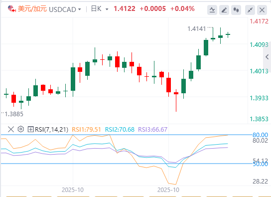 美元/加元货币对可能会测试11月5日触及的七个月新高1.4140。突破该水平将支持该货币对探索上升通道上限1.4230附近的区域。