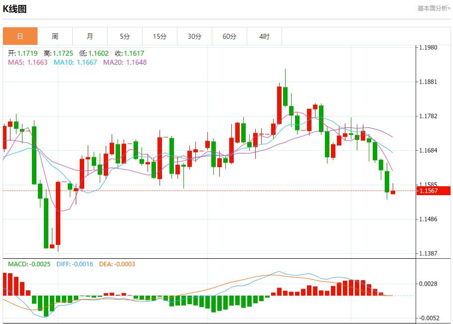 欧元兑美元今日汇率最高1.1575 ,最低1.1573 ,涨跌0.0010 ,涨跌幅0.08% 。