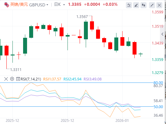 14天相对强弱指数(RSI)位于46(中性),仍低于中线,显示出软动能。从1.3793高点测至1.3009低点,50%回撤位1.3401起到附近阻力位,收盘若收盘高于其上,可能缓解空头压力。