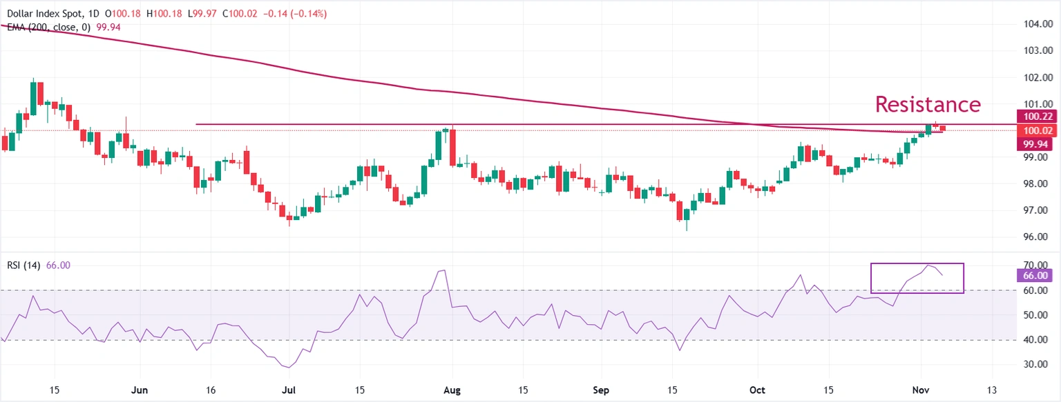 美元指数在周四创下100.36的五个月新高后,努力延续涨势。该资产努力稳定在200日指数移动平均线(EMA)上方,该平均线交投于99.94附近。