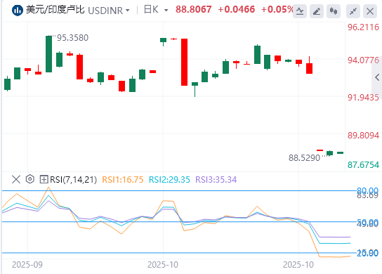 周五,美元/印度卢比小幅上涨至88.75附近。该货币对继续在20日指数移动平均线(EMA)附近找到支撑,该平均线交投于88.60附近。