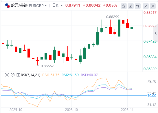 11月7日,欧元/英镑在欧洲早盘交易时段小幅上涨至0.8790附近。英国央行(BoE)的鸽派暂停打压英镑(GBP)兑欧元(EUR)。交易员将从周五晚些时候欧洲央行(ECB)政策制定者的讲话中获得更多线索,其中包括约阿希姆·内格尔和弗兰克·埃尔德森。