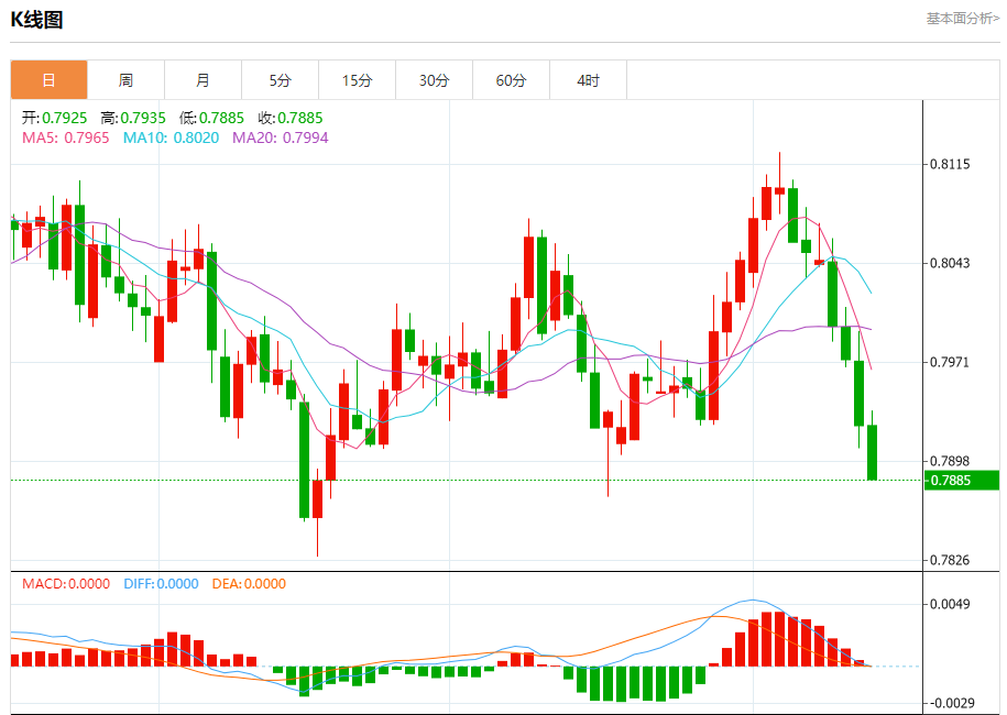 今日周五,澳元兑美元报0.6524,跌幅0.09%;美元兑加元报1.4023,跌幅0.10%;美元兑瑞郎报0.7886,跌幅0.51%。