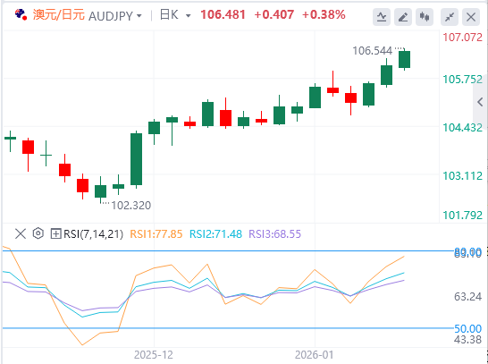1月13日,澳元/日元交叉连续第三天引发后续买盘,并在周二亚洲盘期间攀升至自2024年7月以来的新高,约在106.50-106.55区间。此外,基本面环境有利于多头,表明现货价格阻力最小的路径仍向上行。