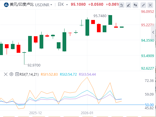 1月13日,周二欧洲早盘,印度卢比/美元开盘下跌,报约90.52,此前美印当天将进行贸易谈判。美元兑印度卢比预计将处于观望状态,因为贸易会议结果对印度卢比影响重大,而印度卢比在2025年仍是表现最差的货币,原因是新德里对华盛顿进口商品征收高额关税。