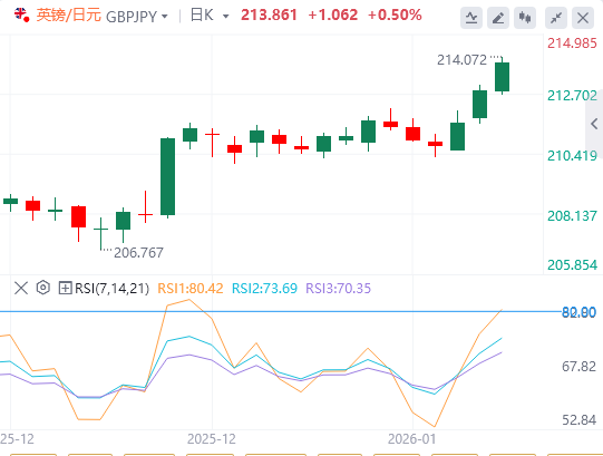 1月13日,英镑/日元在前一天突破近三周区间的基础上,周二连续第三天获得持续的积极势头。现货价格自2008年8月以来已攀升至新高,多头现在希望在日元(JPY)整体走弱的情况下,进一步将上升趋势延伸至214.00关口之外。