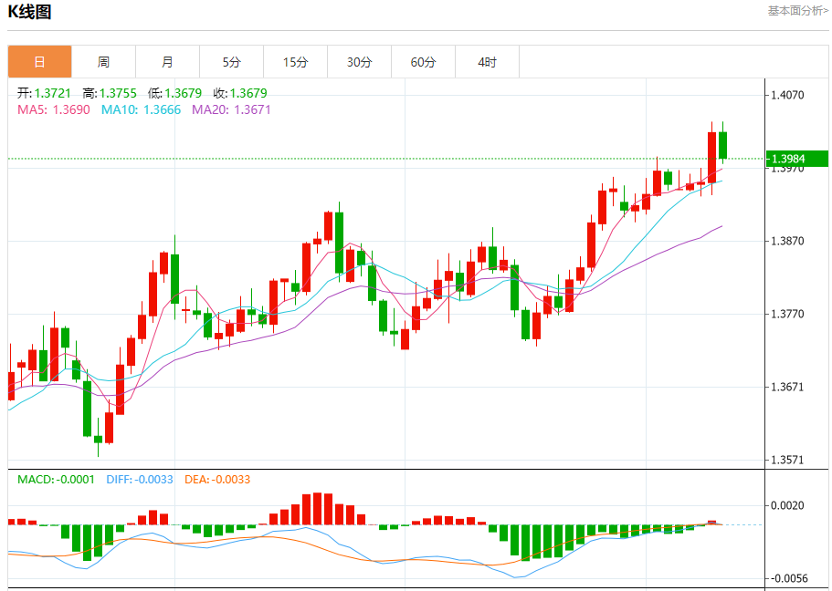 截至目前,美元/加元下跌0.25%,报1.3986。