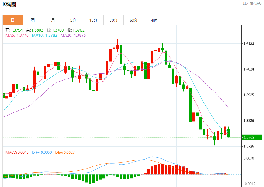 截至目前,美元/加元下跌0.30%,报1.3764。