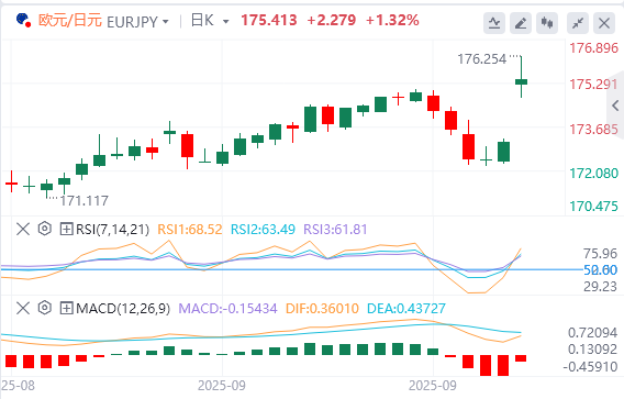 10月6日,在法国总理塞巴斯蒂安·勒科尔努(SébastienLecornu)意外辞职后,欧元周一遭受重创。欧元/日元从长期高点176.25震荡至174.95,然后回到175.00的中间区间。