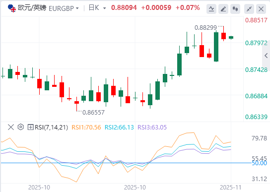 11月6日,周四欧市初盘,欧元/英镑反弹并瞄准2023年5月以来的高点,交投于0.8810附近。在当天晚些时候公布的德国9月工业生产和欧元区零售销售数据之前,货币交叉盘上涨。交易员还等待英国央行(BoE)11月的利率决定。