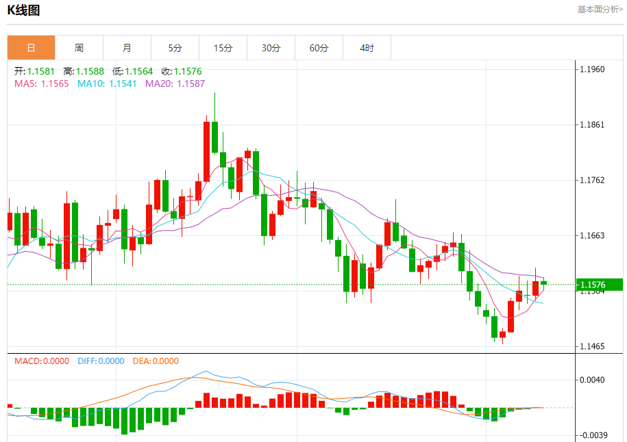 周三盘中,欧元/美元报1.1577,跌幅0.03%。