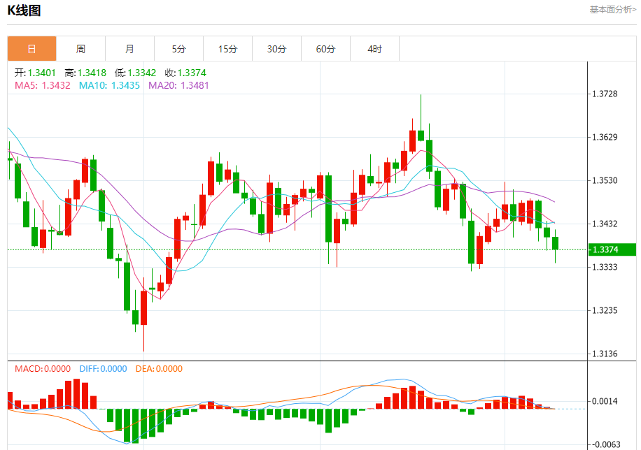 汇价高见1.3418,低见1.3342。上一交易日,汇价收于1.3402。