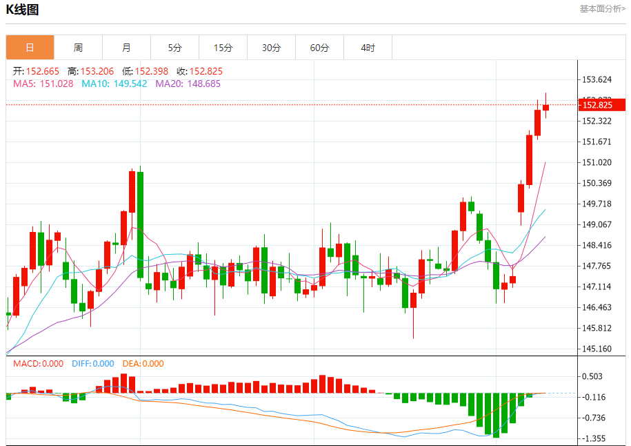 汇价高见153.206,低见152.398。上一交易日,汇价收于152.666。