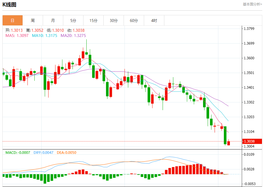 汇价高见1.3052,低见1.3009。上一交易日,汇价收于1.3020。