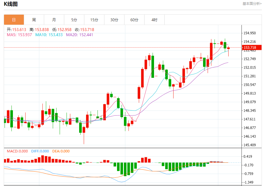 汇价高见153.829,低见152.946。上一交易日,汇价收于153.661。