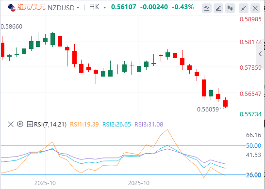 11月7日,纽元/美元连续第二个交易日延续跌势,周五欧洲早盘交易于六个月低点0.5609。由于新西兰储备银行(RBNZ)进一步放松政策的预期,纽元(NZD)下跌,该货币对贬值,市场完全消化了11月在疲软的就业报告后降息25个基点。