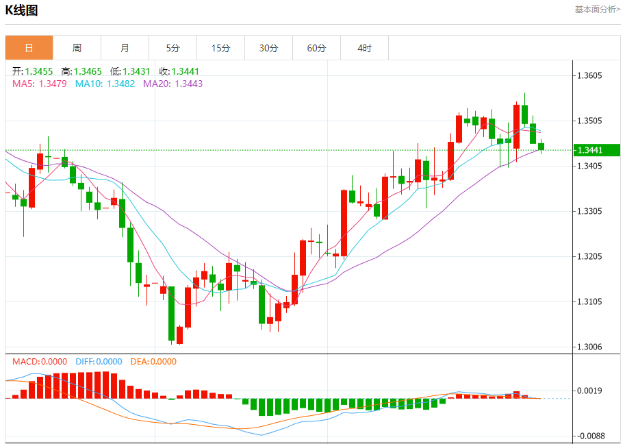 汇价高见1.3465,低见1.3431。上一交易日,汇价收于1.3456。
