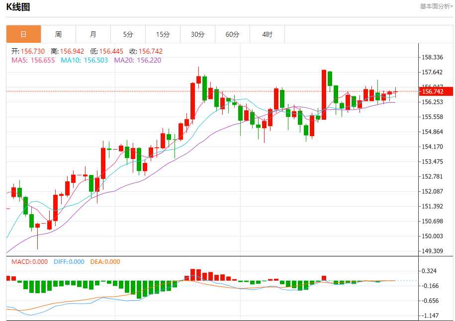 汇价高见156.942,低见156.445。上一交易日,汇价收于156.729。