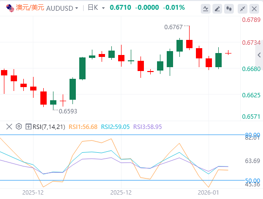澳元/美元周二交易约0.6710。日线图分析显示该货币对反弹至上升通道,显示出新一轮多头偏向。14天相对强弱指数(RSI)位于60.55,仍位于中线之上,支撑上行动能。