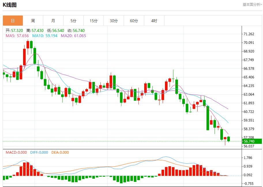 原油市场:截止北京时间20:23,美油下跌,现报56.740,跌幅0.73%。纽市盘前,(原油)在当天的最后交易中价格下跌,随着相对强弱指标开始形成负背离,在价格走势相对过度买入水平后出现负面信号。在短期内主要下行趋势占主导,并且价格沿趋势线交易,同时由于价格低于EMA50,负面压力持续,这降低了近期价格回升的可能性。