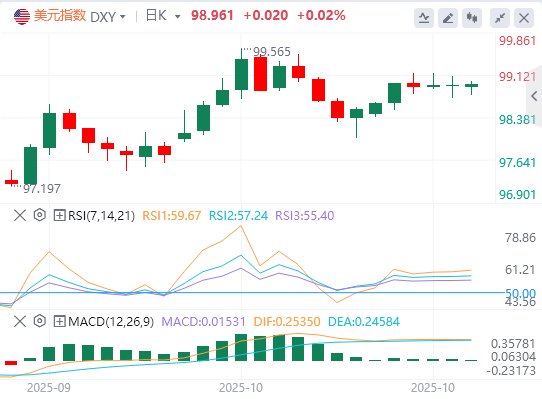 上周五,低于预期的CPI数据提振了市场降息预期,美元指数短线下跌,随后稍有回升,截至目前,美元报价98.96。
