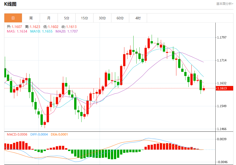 欧元/美元:截止北京时间21:20,欧元/美元上涨,现报1.1616,涨幅0.06%。纽市盘前,欧元兑美元的价格在最后一个交易日上涨,试图挽回之前的一些损失,摆脱相对强弱指标上的超卖状态,进入与价格相比夸大的超买水平,表明这种看涨势头迅速下降,因为其交易低于EMA50,交易以短期为基础,因此持续存在负面压力。
