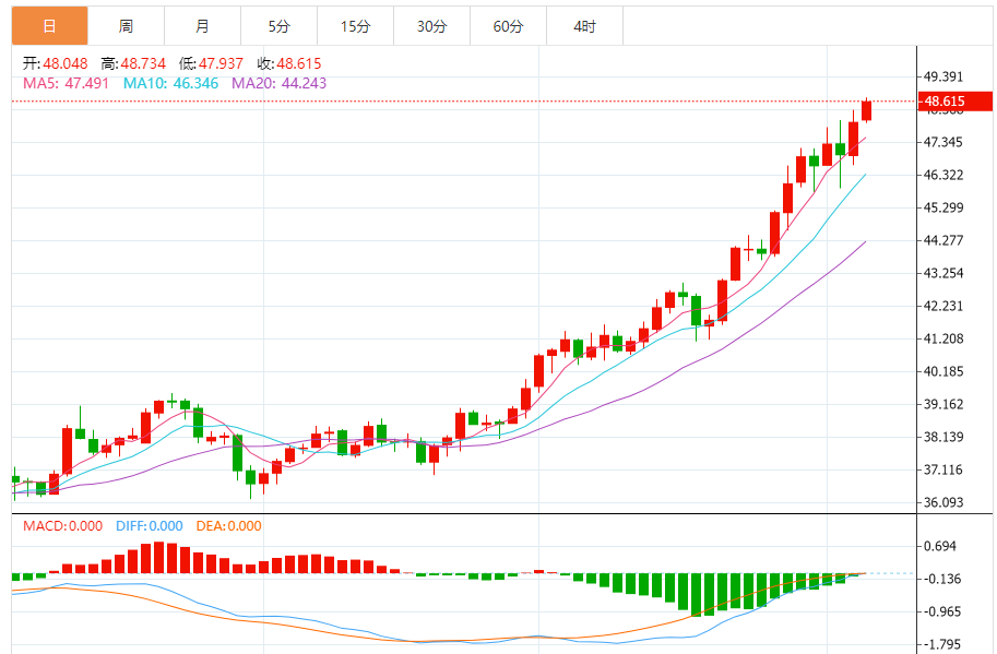 周一(10月6日),现货白银目前位于48.623美元/盎司附近,涨幅为1.36%。
