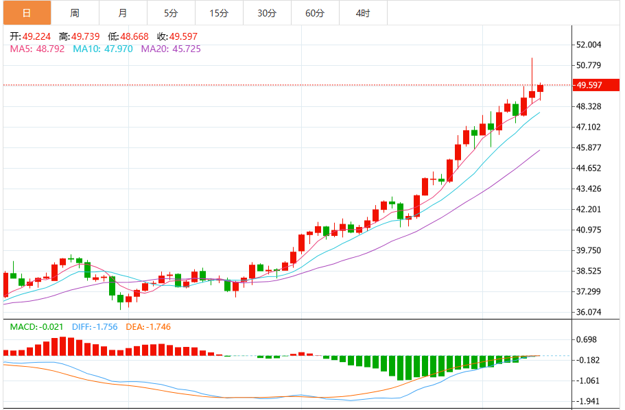 周一(10月13日),现货白银目前位于51.619美元/盎司附近,涨幅为2.73%。