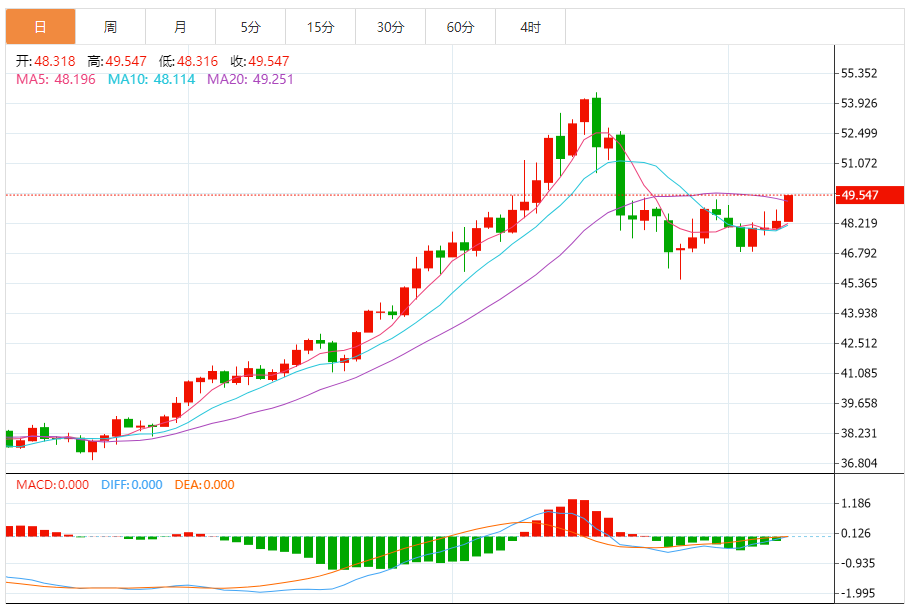 周一(11月10日),现货白银目前位于49.544美元/盎司附近,涨幅为2.52%。
