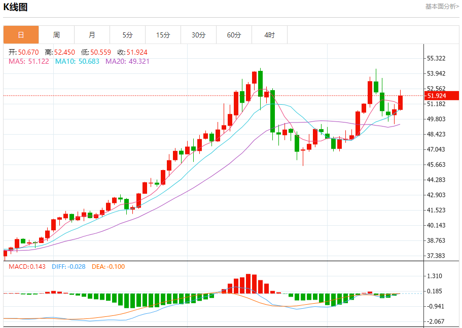 周三盘中,现货白银报51.957,涨幅2.53%。