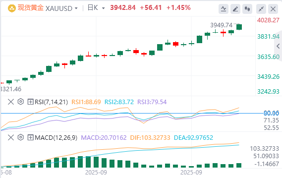 10月6日,黄金在周一欧洲时段上半段攀升至历史新高,并在支撑性基本面背景下有望巩固突破3,950美元水平的势头。投资者似乎相信美联储将在今年年底前再降低两次借贷成本。除此之外,在持续的贸易和地缘政治紧张局势下,对美国政府长期关门可能影响经济表现的担忧支撑了避险商品。