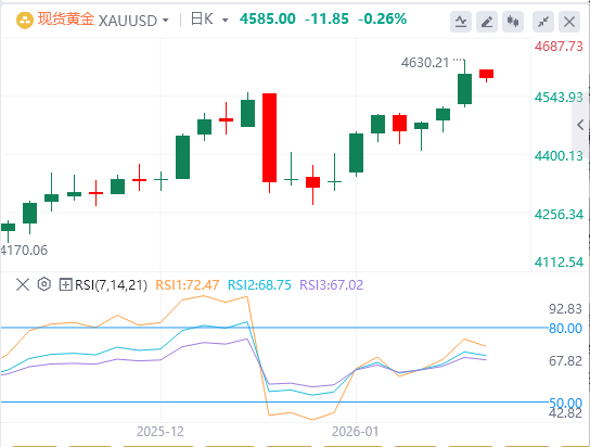 在日线图中,黄金交易价格为4594.62美元。21日简单移动平均线(SMA)高于50日、100日和200日SMA,显示出强劲的看涨动能,价格保持在所有均线之上以强化积极的基调。14日相对强弱指数(RSI)为70.17(超买),这可能会引导价格暂停或出现小幅回调。21日SMA在4417.93美元提供即时动态支撑,价格在其上方时上涨趋势保持完好。