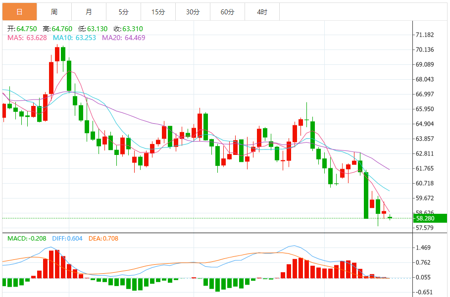 38.2%斐波那契位于61.04美元,而50%水平位于63.41美元,与楔形阻力位重合,可以作为初始上限。更大的修正可能会达到61.8%斐波那契63.18美元,甚至达到100%水平66.63美元,接近100SMA动态拐点。