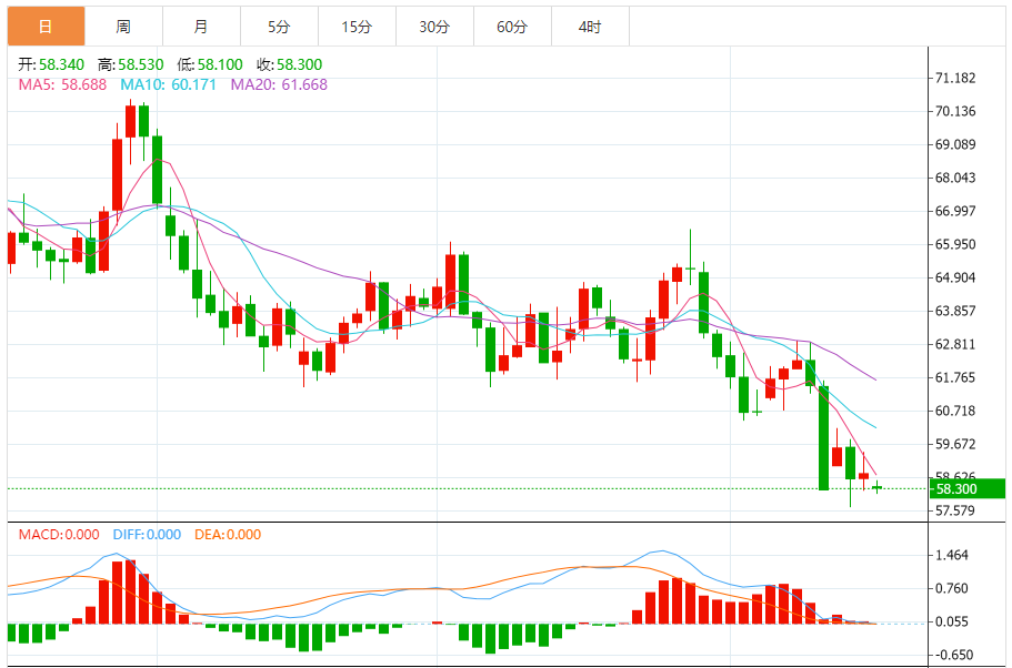 WTI原油在短期时间范围内一直在下降楔形形态内盘整,目前价格约为每桶58.88美元。这种图表的形成通常表明看跌势头减弱,并且有可能出现上行突破。