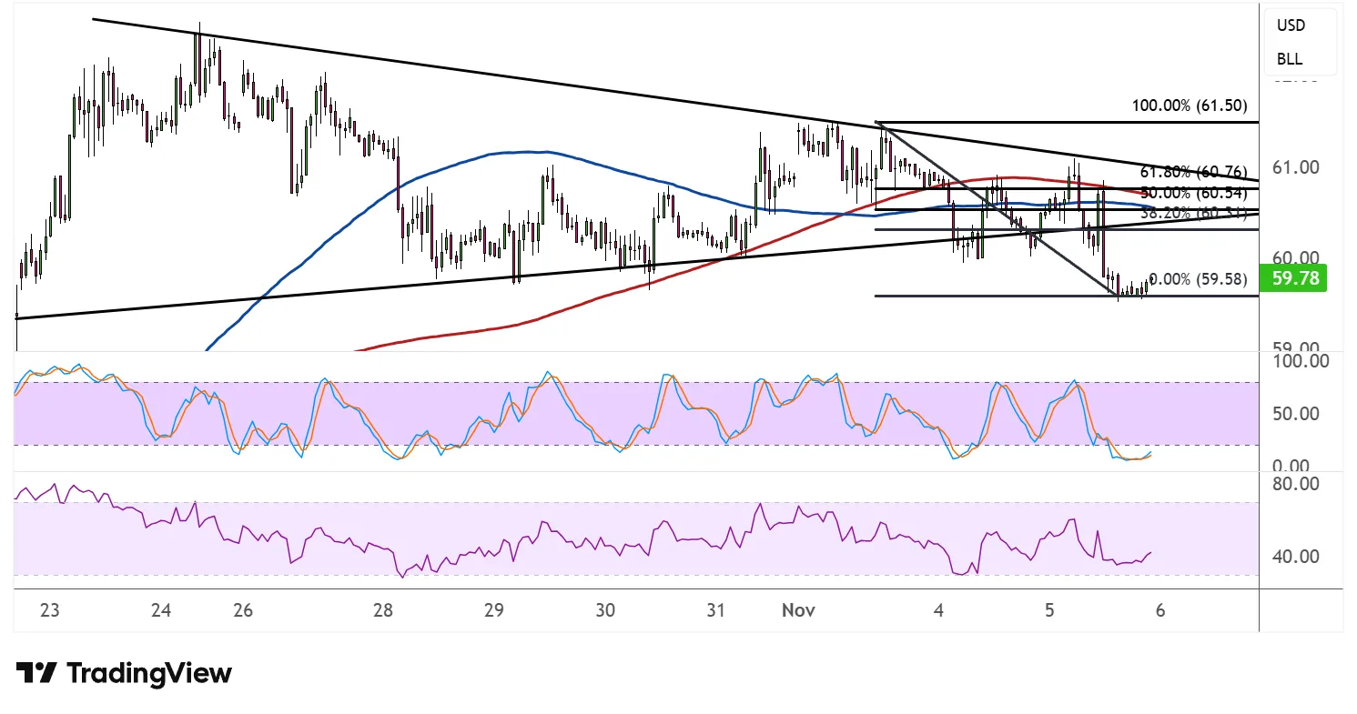 WTI原油已跌破盘整三角形支撑位,表明看跌走势可能正在进行中。价格最近突破了自10月下旬以来一直保持的上升趋势线,跌至59.78美元的水平,证实了近期情绪的转变。