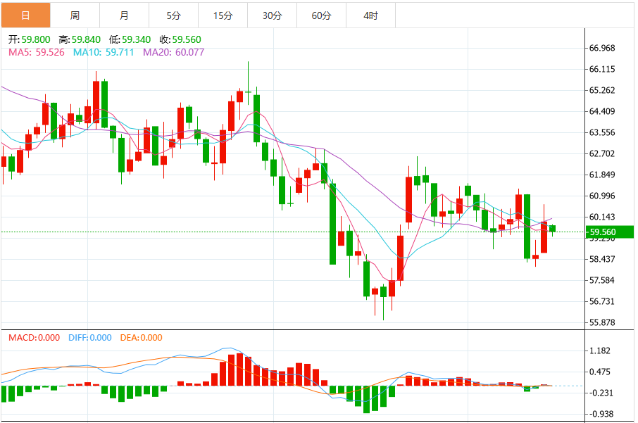 技术上,油价受报告影响跌至58.48关键支撑,巧合的是接连的利好导致油价之后两日快速收复失地,表示多空分歧依然很激烈,目前油价继续守住59.40,油价有望继续围绕59.40展开区间整荡。目前压力位在59.81附近,是周三阴线的50%分位处,支撑依然为59.40和58.48。